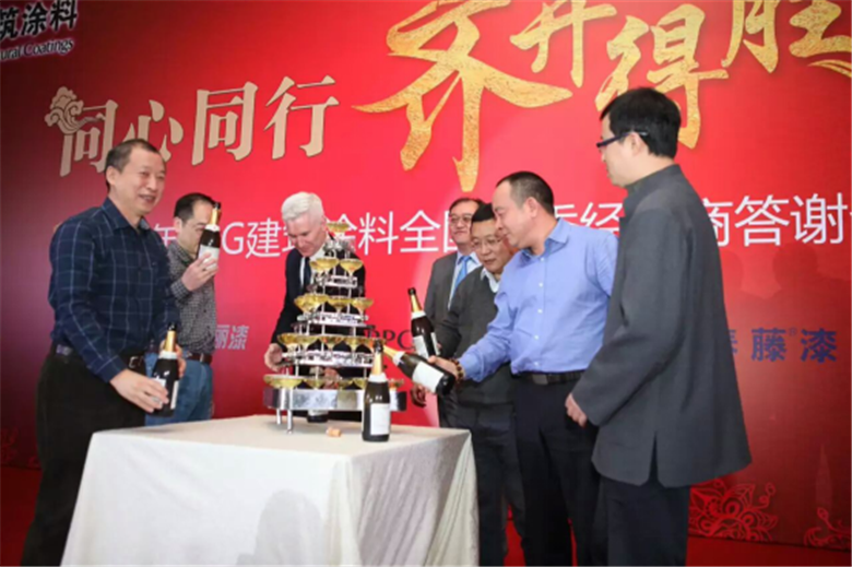 力誠建材獲得全國優(yōu)秀經(jīng)銷商一等獎,賴總同PPG亞太區(qū)總裁Mike Horton、中國區(qū)總經(jīng)理葛樂凡以及其他地區(qū)的優(yōu)秀經(jīng)銷商代表一同慶祝。