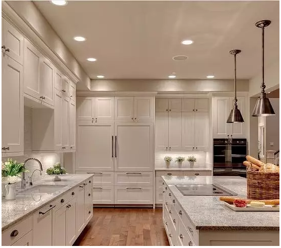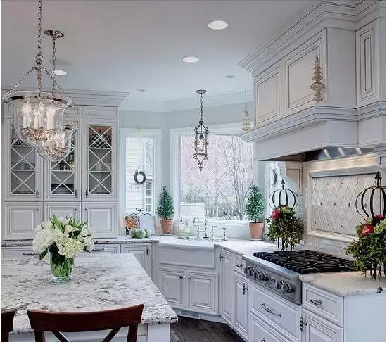 所以,如果櫥柜做到頂要滿(mǎn)足空間感及美觀(guān)的一般是廚房空間比較大,甚至是開(kāi)放式廚房,設(shè)計(jì)層次感較多,相對(duì)復(fù)雜一點(diǎn),并且很少會(huì)有現(xiàn)代風(fēng)格的,如下圖: